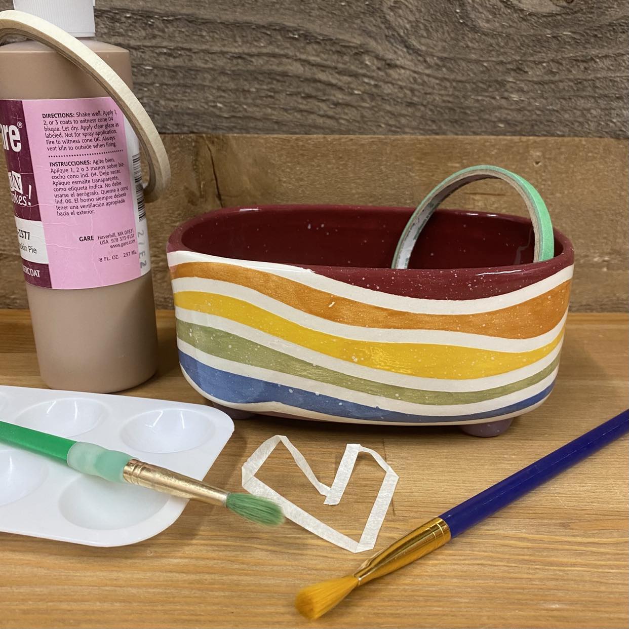 Create a nontraditional rainbow on nearly any surface; with 50 color options, pottery of all shapes and sizes as well as a variety of masking tapes the options are endless! We will teach you our pro tips for clean masking and encourage you to show your true colors ♥
